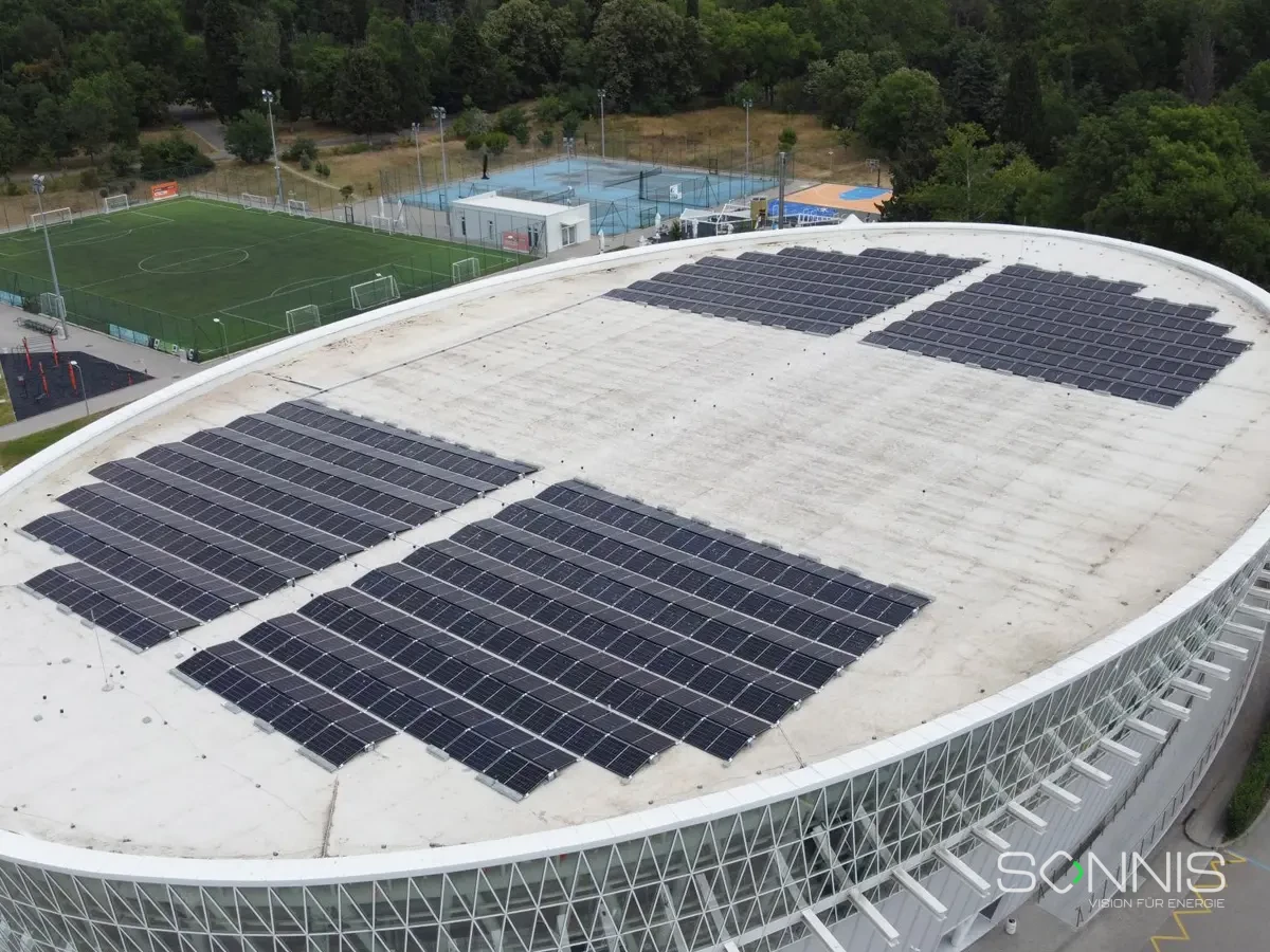 Last year, a photovoltaic system with a total capacity of 253.44 kWp was installed on the roof of a swimming pool building. Particularly efficient: the electricity generated on site flows directly into the swimming complex’s own consumption. Thanks to implementation in just 20 days, the system was able to go into operation on schedule.